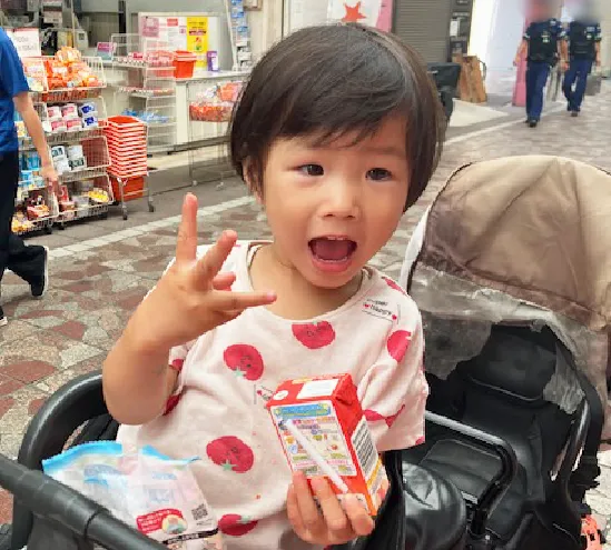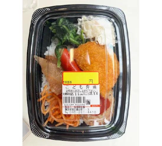 お弁当の中身は、特注 ばかうま食堂 こども弁当(ハンバーグ、ウィンナー、ナポリタン、コロッケ、ポテトサラダ、青菜の炒め物、豚トロ、ご飯)、お菓子はビスコ、アンパンマンジュース4種類中の1個(やさいとりんご、みかんミックス ビタミンC 、完熟りんご、ぶどうとりんご)です。