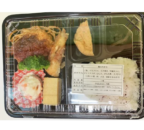 お弁当の中身は、特注 鍵家 お子様仕出し弁当(イカフライ、竹輪天ぷら、ポテトサラダ、玉子焼き、煮物2品、スパゲッティ、ブロッコリー、ゆかりご飯)、お菓子はビスコ、アンパンマンジュース4種類中の1個(やさいとりんご、みかんミックス ビタミンC 、完熟りんご、ぶどうとりんご)です。