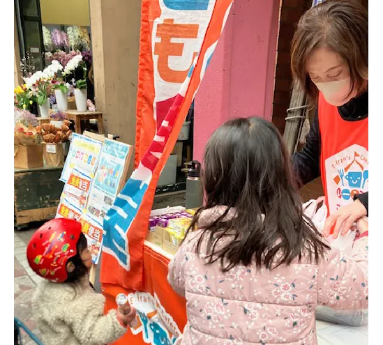横浜橋通り商店街での活動は、なかなかリピーターが増えず、子ども連れで買い物に来ている御家族に声掛けをしています。