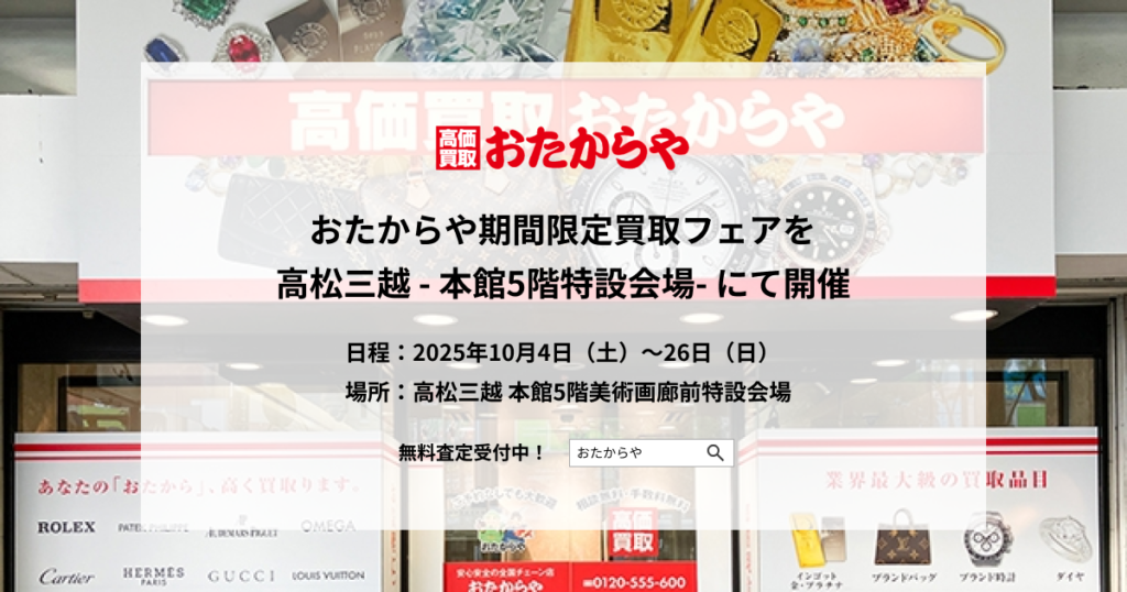 株式会社いーふらん(本社:神奈川県横浜市、代表取締役社長 鹿村大志、以下いーふらん)は、いーふらんが展開する「おたからや」事業において、10月4日(土)より高松三越にて期間限定の買取フェアを開催しておりますことをお知らせいたします。
