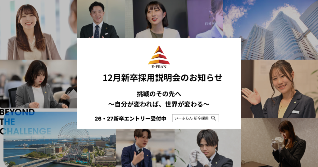 株式会社いーふらん(本社:神奈川県横浜市、代表取締役社長 鹿村大志、以下いーふらん)は、2026年卒、2027年卒の学生を対象とした会社説明会(オフライン・オンライン)12月分の日程を決定しましたことをお知らせいたします。